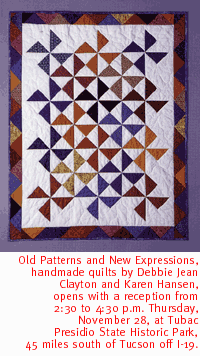 City Week includes events selected by Calendar Editor Tim Vanderpool. Event information is accurate as of press time. The Weekly recommends calling event organizers to check for last-minute changes in location, time, price, etc. To have material considered, please send complete information at least 11 days prior to the Thursday issue date to: Tucson Weekly, P.O. Box 2429, Tucson, Arizona 85702, or fax information to 792-2096, or email us at [email protected].