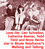 It's interesting to compare these "new" female-centered movies with earlier examples of what were called women's films--'40s movies about self-sacrificing heroines intended for a mostly female, matinee audience, like the Joan Crawford classic Mildred Pierce. The best of these films were engrossing in part because they nurtured dark, resentful feelings towards marriage and motherhood which, in those days, couldn't be expressed directly. Mildred Pierce slaves on behalf of her child, and the ungrateful kid ends up seducing her husband! But in the new breed of women's films, the ambivalence about relationships, sex and motherhood has come out into the open. Laura, in fact, is a therapist-in-training who is especially forthright about her feelings--especially about what marriage would mean to her friendship with Amelia. A film like Walking and Talking of course lacks the resonance and gritty darkness of the '40s versions, but on the up side, the female characters are no longer tragic, and friendship between women has become a positive force, rather than evil and corrosive. In fact, Walking and Talking is quite funny; Catherine Keener would be a perfect Woody Allen heroine; intelligent but self-effacing, with a knack for getting involved with the crazies of New York. She's also so good that it's hard to focus on the other actors in the movie; the friend I saw the movie with was so taken by her engrossing, naturalistic performance that he developed a scheme for a Catherine Keener TV channel, where you could tune in at any time and just watch Catherine Keener react to things: Catherine Keener squeezes a melon; Catherine Keener looks at a cat, etc. While we're waiting for that to get into development, the movie version makes a pretty good stop-gap.