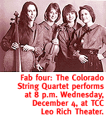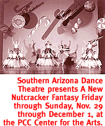 Gift wrapping will be available, with proceeds going to the Arizona Children's Home. The open house runs from 6 to 9 p.m. in the plaza courtyard, located at the southeast corner of River Road and Campbell Avenue. Call 326-9200 for information. SCROOGED. Little Timmy will have a darned happy holiday despite Ebenezer, if the ingenues of the Southern Arizona Dance Theater have their way. And they likely will, with innovative performances of A Christmas Carol and A New Nutcracker Fantasy. Now in its fourth year, the troupe features both veteran and relatively new high-steppers. Or, as Artistic Director Jane Matty Willett says, "We take pride in our efforts to utilize professional-level dancers as role models for young dancers, knowing that great lessons can be learned within the performance experience." Learn your own lessons about what the Christmas season was truly meant to be with performances at 7 tonight, at 2 and 7 p.m. tomorrow, and at 2 p.m. Sunday at the PCC Proscenium Theater, 2202 W. Anklam Road. Tickets are $8 for adults and $5 for kids and seniors. Call 881-4288 for reservations.