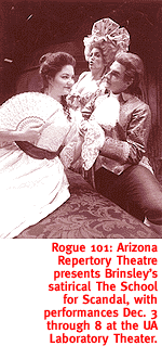 MUCKRAKERS. Gossip everywhere, vicious, malicious and downright ornery rumors. Sound like your current relationship? Well, it's also the dark theme of Richard Brinsley Sheridan's The School For Scandal, presented by the UA Repertory Theatre. Directed by Harold Dixon, this production of Brinsley's most successful play drips "with strokes of pointed satire, a rich vein of humor, great genius and biting wit," says UA Theatre Arts Department spokeswoman Julia DeHesus. You've got Charles Surface, who's happy-go-lucky and honest, though not real deep. That means his brother Joseph is required to be a scheming hypocrite. Charles and Maria are in love, and Joseph is subsequently obliged to woo her as well, even as he two-times young Lady Teazle. Meanwhile, the scandal mongers mingle behind the scenes. The School for Scandal runs at 8 p.m. tonight through Saturday, December 7, and at 2 p.m. December 7 and 8, at the Laboratory Theatre in the UA Fine Arts complex, southeast corner of Park Avenue and Speedway. Tickets are $13 to $15, with discounts for students and seniors, available at the UA Fine Arts box office. Call 621-1162 for reservations and information.