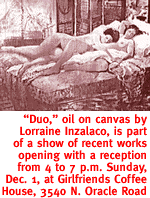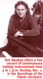 Now Soundings brings Barabas to town for the Magic in December holiday performance. The show will include composer Dean Evenson on Native American and silver flutes, acoustic originals by the local band Milkseed, and food and crafts. The free event runs from 3 to 7 p.m. in the Soundings of the Planet Courtyard, 3054 N. First Ave. For information, call 792-9888. ILLUMINATI. "The day has passed," poet Elizabeth Ramadori writes in My House. "Ruddy as an old man easing, Into his warm bath, the sun sighs a low hope, Along the Horizon." Sundown today will bring a reading by Ramadori, presented as another installment of the Lamplight Reading Series. Joining her will be L.D. Clark, author of four novels including The Dove Tree, The Fifth Wind, A Charge of Angels and A Bright Tragic Thing. The free readings begin at 5 p.m. at the Blue Willow Restaurant, 2616 N. Campbell Ave. Call 908-0927 for information.