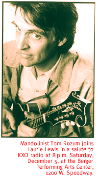 The action will include a folklorico performance of the "Zoot Suit Dance," and tons of tunes from the 1930s through '50s. Wear your vintage clothes. There will also be chow and drinks. The party runs from 4:30 to 7:30 p.m. in the Heart-Five club, 61 E. Congress St. Advance tickets are $15, $25 for couples, and available by calling 327-4485. Tickets are $5 more at the door. WEAVING HISTORY. More than 200 Indian crafters travel to Tucson from around the state today for the Celebration of Basket Weaving. This ancient art will be displayed full-force, with weavers selling their wares, providing cultural presentations such as traditional basket dances and storytelling, and offering demonstrations of basketry techniques used by various tribes. There will also be a display on basket-weaving traditions among native peoples of the Sonoran desert. Event hours are 10 a.m. to 4 p.m. at the Arizona-Sonora Desert Museum, 2021 N. Kinney Road. Admission is free with regular museum admission, which is $8.95 for adults ages 13 and over, $1.75 for children ages 6 to 12, and free for children under age 6. For information, call 883-2702. FM FIESTA. KXCI-FM, community radio 91.3, celebrates 15 years of turning Tucson on to great tunes with a concert by Laurie Lewis and Tom Rozum. This stellar evening of folk, acoustic country and bluegrass kicks off with a set by local hard-pickin' heroes, the Titan Valley Trio. Lewis is a heavyweight in bluegrass and traditional country, a top singer/songwriter and champion fiddle player. Her Rounder Records album, The Oak and the Laurel (recorded with Rozum on mandolin), was a 1996 Grammy nominee. She was first joined by Rozum on mandolin in the '70s, in the seminal Grant Street Band. Show time is 8 p.m. in the Berger Performing Arts Center, 1200 W. Speedway. Advance tickets are $16 and $18, with $2 discounts for TFTM, DBA, TKMA and KXCI members. Get them in advance at the Folk Shop, Piney Hollow and KXCI. Tickets are $2 more at the door. Call 623-1000 for information.