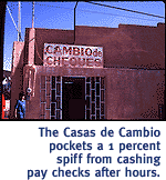 Maquila execs secure five- and six-digit salaries, while line workers garner two times the Mexican minimum wage. The Casas de Cambio pockets a 1 percent spiff from cashing pay checks after hours. And Ley and EconoMax supermarkets are seeing profits rise thanks to maquila food coupons. Even local suppliers win contracts with the multi-national corporations. Glossy trade mags sport pages of women with mile-wide hair, shiny lips and business suits, and headlines proclaiming "Maquila Women Climbing the Ladder of Success," or the less sexy "Maquila of the Month." And while the financial crisis of the peso crash forced 55 Nogales businesses closed last year, the foreign-owned maquilas hired 5,000 new workers. Only two Mexican-owned factories still survive in the border town with a couple dozen workers in each. The swollen dollar has allowed the maquilas to boom, as the crippling effect of inflation has enticed physicians, psychologists and teachers into second and third shifts inside the faceless monoliths. A continuous supply of applicants from the South streams into the pastel-colored plants tucked discreetly outside the city's tourist district. Illiterate labor is turned away. Economic development types north of the border speak of Nogales' role in the global economy, worker career trajectories, and high-tech jobs. They insist the local maquilas are no longer Dickensian. Yet the industry stonewalls questions about operations. The average quoted turnover rate still hovers at 10 percent in spite of worker bonuses, free healthcare and rides to work. Ensconced in his hilltop Nogales Chamber of Commerce office north of the border, director Fred Johnson says the press have "burned the maquilas." Arranging a tour might be difficult. As expected, Johnson has a reputation for pushing alarming news off front pages. For just as Mexico's neoliberal economics have created dependency on swings in the U.S. economy, Nogales, Arizona, has become desperately reliant on maquila workers spending their pay on its north-of-the-border streets.