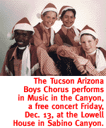 CANYON CHORUS. The Friends of Sabino Canyon and the Forest Service host the second annual Music in the Canyon holiday festival. There will be plenty of food and drink, with music provided by the Tucson Flute Club's Large Ensemble, Tucson Boys Chorus, Utterback Middle School Jazz Band, Old Pueblo Madrigal Singers and Walden, a wind quintet. Tucson Kitchen Musicians Association members will also be strolling about at various locations, and even Santa and Smokey Bear are slated for appearances. The free celebration runs from 5 to 9 p.m., starting in the Sabino Canyon parking lot, 5700 N. Sabino Canyon Road. Luminaria-lit pathways will then lead visitors to the historic Lowell House for the musical performances. For details, call 749-8700. SEAMY GREETINGS. Bob Girth, proud proprietor of Babylon Tucson, the city's oldest and finest cybercafe, is gearing up for a multi-ethnic, pan-religious holiday (lovingly known as a the Eurocentrically Imposed Midwinter Festival). And this year Big Bob has something in store for all: Santas stuffed with green corn tamales roasting over a yule-log fire, elves belting "Oy to the World" and "Mazel Tov Y'all," and even a nifty little web page for St. Nick--at www.kringle.com. This full-length comedy play with original music evolved from a Sweatlodge mindmeld, mastermined by Nick Seivert, Dave Sullivan, Elliot Glicksman and Fish Karma. Deck the Halls With a Babylon Tucson Holiday--The Cool Yule takes the stage at 7 p.m. Friday and Saturday and 3 p.m. Sunday through January 5, at the Serendipity Playhouse, 7000 E. Tanque Verde Road. Tickets are $11 for adults, $9 for students, seniors and active military, and $6 for kids under age 12. There will also be a $1 discount with a can of food for the Tucson Community Food Bank. For information, call 751-4445.