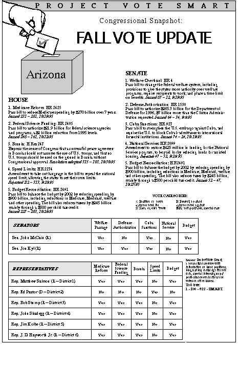 Here, for the record, are some recent votes cast by Arizona's congressional delegation, provided by Project Vote Smart, a non-partisan gang which can give you all sorts of info about your elected officials if you just call (800) 622-SMART.