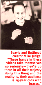 "It's kind of tricky for Beavis and Butthead, because they're really dumb, and when you're writing, you're going, well, they're in the trunk, they can't exactly pick the lock," says Judge, sharing a bit of insight into his creative process. "Well, there's a jack in the trunk...jack...there's a jack-off joke in there somewhere...." So does the jump to big screen mean the buttmunch boys are getting too big for the tube? "I think they're too big for TV and I don't want to do TV anymore," Judge admits. "I still have one season on my contract. I'd like to stop doing the show for awhile and take a break from it." Although he imagines he'll make another B&B movie or specials for MTV, Judge has already begun work on a new animated series, King of the Hill, which debuts on the Fox network next month. "It's quite a bit different from Beavis and Butthead," Judge says. "The closest thing to it in Beavis and Butthead is Tom Anderson, the old guy. It's kind of like a bunch of bubba types in Texas." Judge doesn't put much stock in critics who gripe that Beavis and Butthead are harbingers of the decline of American civilization. "I think there are lot of symbols of decline other than this," Judge says. "Before it was even on the air, Connie Chung did something about how bad TV has gotten, and she said, 'MTV has gone so far as to name one of its new shows Beavis and Butthead.' Of course, she's married to Maury Povich. "Talk about decline," Judge adds, slipping into Butthead's voice. "When she was fired, I said, 'That's cool.' "