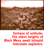 At the northern boundary for the New Water Mountains Wilderness Area, I park and continue on foot. From the pile of boulders and recently replaced Wilderness Area markers, the Bureau of Land Management clearly has had trouble keeping people from driving in here. If you want to drive, go to L.A. There are few places left in the world where you can't take a car. Enjoy them. It's an Arizona adage that all roads lead either to another road, cattle or a mine. Obviously, whoever bladed this road wanted to defy that notion. The road runs for another mile and then terminates, at the top of a hill. The view from here into the wide-open miles of the Kofa National Wildlife Refuge to the south does a lot to ease my urban angst. It also demands an amendment (places with a view) to the road adage. Happily, the last stretch of this road is rapidly reverting to desert. With the better part of a day remaining, I head down the peak and across desert terrain toward the foot of Black Mesa. From this side the giant slopes still demand respect, but along one ridgeline they offer the hope of ascent. No vertical cliff guards this approach, although about 50 million basalt boulders do. Stacked into a menacing, occasionally mobile talus slope, this army of stones turns out to be a fairly accommodating stairway to the top of the mesa. It just requires a certain tolerance for stairways that move--and a bit of faith that the whole enchilada isn't going to start cascading. Oh yeah, and a lot of sweat. I reach the top and lean back into a throne of black stone. The air is clear and crisp. The wind gusts now and then, but the sun on the basalt is warm. I retrace my route across the foothills and along the old road. Distant washes, jagged peaks and alluring nooks in remote canyons provide fodder for imagined adventures. To the north lies freeway and its speeding traffic. I resign myself to being among them soon enough. But for now, I'm enjoying the ride.