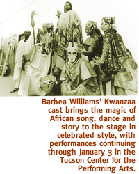 Each day of the festival is marked by a principle, ranging from unity to collective work and responsibility. And each is noted by lighting a single candle, or mishumaa, representing the days' principle. Traditional African dishes are served each evening, followed by passing the cup of unity, or kikombe cha umoja. "We choose to celebrate Kwanzaa because we're choosing to celebrate ourselves," Williams says. "And it's an opportunity to share something about who you are to the people in your community." In recognition of the holiday, Williams and her troupe will present a performance using Kwanzaa songs, symbols, rituals and principles intertwined with traditional folk tales. The production will include masks designed by Roosevelt Smith, and will feature Eno Washington, Tariq Rasool, and Barbea's children, Beah and Beyah Williams-Rasool. Show times are 3 and 8 p.m. today, and 3 and 7:30 p.m. Sunday, in the Tucson Center for Performing Arts, 408 S. Sixth Ave. Performances continue at 8 p.m. Friday, 3 and 8 p.m. Saturday, and 3 and 7:30 p.m. Sunday, January 1 through 3. Advance tickets are $10, $8 for students and seniors, $5 for children under age 12, and are available at Al's Barber Shop, Antigone Books, Hair on Wheels, Rainbow Accessories, or by calling 298-4772. Tickets are $2 more at the door.