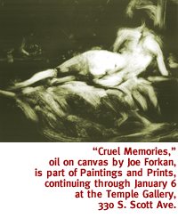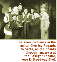 WELCOME BACK. Lisa Larrabee is a '93 graduate of Utterback Middle School. Currently, she's an illustration and design major at the Kansas City Art Institute, where she hopes "to capture a sense of fulfillment and individual creativity through freelance illustration." Now she's back at Utterback, this time to display her work in the school's G.A.S.P. (Great Art by Students and Professionals) Gallery, where she served as a docent not too long ago. You can view the fruit of Larrabee's artistic metamorphosis during regular school hours, through January 30, at Utterback Middle School, 3233 S. Pinal Vista. Call 617-6100 for information. CELESTIAL SEASONINGS. The UA Flandrau Science Center and Planetarium rings in the season with a smorgasbord of spatially spectacular laser shows. The Copper State's evening palette is the topic in Under Arizona Skies, while the mind-boggling scale of the cosmos is brought to earth in Light-Years from Andromeda. Seeing the Invisible Universe offers a peek at the intergalactic, non-visual spectrum, with animated sequences uncovering the mysteries of supernovae, black holes, quasars and our own Milky Way. Discovering Lasers likewise explores how laser light is made.