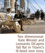 This he does beautifully. Using actual footage of the 80-year-old wreck and computer-enhanced, life-sized models, Cameron's Titanic surpasses imagination. The spectacle is breathtaking. But Cameron makes the audience wade through two hours of Jack-and-Rose tripe before unveiling this feat of technology. And Cameron needs the collision to propel his story: The indistinct iceberg is barely spotted, the colossal boat turns too late, the imperfect hull cracks on impact. And the water rushes in. As the vessel evocatively splits in two, we can't help but be moved. Unfortunately, Cameron again strays from history as panic sweeps the decks. Instead of creating an historically and visually accurate Titanic triumph, he offers a monster movie pocked with shallow, fictional characters. Real heroes are pushed aside for flashier, less complicated ones, and fact folds into fiction. Captain E.J. Smith (Bernard Hill), who never so much as scraped paint in his 27 years of service, comes across as incompetent and uncaring, and his officers seem equally culpable. In Cameron's version, lookout Frederick Fleet is distracted from his post because he's watching Rose and Jack make out on deck just before the collision occurs, and White Star Line director Bruce Ismay (Jonathan Hyde) mercilessly sneaks aboard a lifeboat as Cal Hockley bribes First Officer Murdoch for a seat in another. Ismay has long been acquitted, and nothing in history suggests such an offer between Murdoch and a passenger. By telling such fictions, Cameron unnecessarily robs graves.