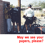 ![]() The U.S. Border Patrol's Units Are Out In Numbers Befitting A Nazi Jew-Bashing Extravaganza. By J. E. Relly LAURA MENDOZA'S citizenship document provided little security on a Thursday morning recently. The 20-year-old Pueblo High School graduate had just finished her shower and wrapped on a robe when she heard the word "Migra!" as her boyfriend's brother Jesus rushed down the hall of her apartment and into the back bedroom. By the time she made it into the living room, seven male Border Patrol agents were staring in from doors on both sides of her South 25th Avenue apartment. According to Mendoza, one of the four agents at the sliding glass door demanded that she let them in. There was no search warrant. "They said Jesus was running from them," says Mendoza, an act considered suspicious behavior by the agency. "They said, 'If you don't let us in, we're still coming in.' "I knew they didn't have the right. Even though I have my papers, I was nervous. They said they'd take me if I didn't cooperate." Eventually Mendoza allowed the agents inside. But the Border Patrol's behavior in this incident was nothing short of intimidation. "We're not in the habit of breaking down doors," says Border Patrol spokesman Rob Daniels. "We have to have permission to go into a home. We don't arbitrarily enter." Mendoza says once the agents had handcuffed Jesus, who is undocumented, he told them he hadn't been running as they contended. "One of (the agents) told him, 'Shut up, I wasn't talking to you,' " she recounts. Then, as with many of the 27,188 people apprehended during the past year in Tucson, the agents loaded Jesus up in a government mini van and drove him down to the Border Patrol station for processing. Like numerous other people reporting questionable incidents with the Border Patrol, Mendoza will not be filing a complaint with the Office of the Inspector General. Guadalupe Castillo, a community activist with the human rights group Derechos Humanos, says investigators for the Inspector General's office are former Border Patrol agents. The Border Patrol has broad enforcement powers and little accountability, she charges. "We have never seen any (effectual) response to anyone in the community (filing complaints). The fact there is no effective system for reporting makes it easier for the violations to persist."