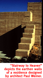 ![]() 'Twenty Years of Rammed Earth' Celebrates Building In The Desert. By Mari Wadsworth BUILDER QUENTIN Branch loves to play with dirt. In fact, he's built his own company, Rammed Earth Solar Homes, and a distinguished career around his passion for earth. Anyone who's built with rammed earth locally knows Branch, who's championed its use in Tucson and surrounding communities for the past 20 years. Some credit him as a pioneer of the form, a designer-builder who's continued "developing the tools and technology... working hand in hand with architects and owner-builders to turn their dreams into reality." His accomplishments are the subject of a retrospective currently showing at Meliora Architectural Gallery, 178 E. Broadway. The show, which covers a broad spectrum of projects and building types, is more a celebration of the form itself than of architectural design. Epithets extolling the virtues of rammed earth dangle from wires above and around the projects: soil, ancient, natural, light, down-and-dirty, energy, shelter. Perhaps the "primal" and "hug-a-tree" that follow are a little hokey, but these words that hang in the air effectively convey the idea that rammed earth is an emotive response to a landscape of modern architecture often dismissed as cold and sterile. The compacted earth, an aggregate of local dirt and gravel (the only non-local material is the three-percent Portland cement added to hasten drying), is at once malleable and permanent, able to accommodate designs of the 21st century that have a low environmental impact and a timeless character. Enlarged color photographs, 27 images in all, walk the viewer through interiors and exteriors utilizing aesthetic and energy-saving advantages of building with dirt, from a kiva in the Catalina Foothills to a bank in Sierra Vista, from a contemporary Southwestern living room to a grand arch, reminiscent of an ancient Roman city gate, built as a display at the Southern Arizona Home Builders Association Home Show last spring.