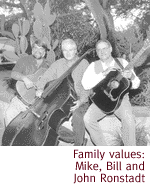 John recalls stories of their Aunt Louisa, better known as Louisa Espinel, an internationally renowned singer and performer in the 1930s. "She was the half-sister of my father, Edward," he remembers. "She opened for the Temple of Music and Art in 1927. Around that time she'd been performing all over the country, then she went to Spain and studied music of all different regions. In her performances, she would come out in the native costumes of each region that she was singing about. She traveled all around the world doing concerts like that...she was the first major star in the Ronstadt family." He notes that in her time, she was comparable to Linda. In 1946, Louisa published a collection of Mexican folk songs, Canciones de Mi Padre, as a tribute to her father Fred. Forty years later, her niece Linda followed suit by performing and recording a similar collection for her father, Gilbert. Music has been in the Ronstadt family as far back as John can remember: "My father played sousaphone, piano and organ. Music was always in the house from a very early age. There was a lot of influence from Mexican music...and classical. My father loved classical--he played Beethoven and Bach all the time. I can still remember my grandfather playing guitar and flute...I can almost remember the sound of his voice." Just as other members in his famous family, John, 48, has also demonstrated his musical versatility. In addition to singing with 'Round Midnight, a well-known local jazz group, he also plays guitar and sings with the Ronstadt Cousins. The singing trio of cousins was formed about seven years ago with Michael, who also plays guitar, and Bill, on bass. Prior to that, Bill and John played for several years in a group called Sunshower. The Ronstadt Cousins, known for their rich, three-part harmonies, play enough musical variety to please any audience. Although a large part of their repertoire includes the regional cowboy and western ballads, as well as the Mexican songs of their fathers and grandfathers, they also sing classics and standards of all generations, not to mention Latin, classic rock and roll, country, bluegrass and folk. "We do a lot of the Mexican trio songs with the (Ronstadt) Cousins," explains John. "I love singing the Mexican songs. The harmony and just the mood are so haunting to me. My dad and I sing them together...they are really special to me."